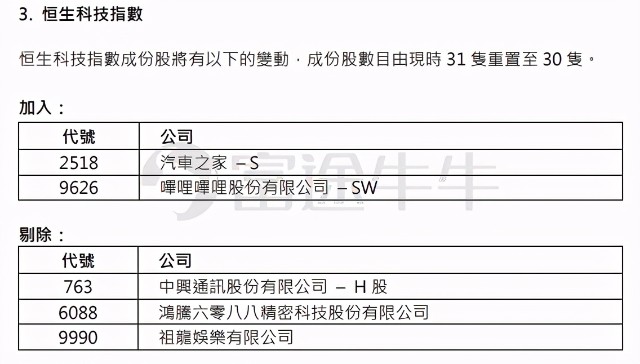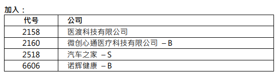 æ'æå£æ£å°è¡¥éæ°æè"ç¹æ¸¯è¡éä¹°åååææ"¹å ä¸è¯ç½' from www.cs.com.cn 11月10日香港恒生指数公司公布的恒指季检结果将于12月4日(下周一)生效,成份股变动上,碧桂园 (02007.hk)、舜宇光学科技 (02382.hk)代替昆仑能源 (00135.hk)以及国泰航空 (00293.hk)进入恒指成份股,国泰航空结束了长达31年的蓝筹身份。. 5月21日港股收盘后, 恒生指数 ( 27344.541, 191.41, 0.71%) 公司公布恒生系列指数调整的正式检讨结果。. 恒指公司11月13日将公布q3季检结果 智通财经app获悉,恒生指数公司宣布,将于2020年11 月13日(星期五) 宣布2020年第三季度的恒生指数系列检讨结果,恒生指数系列的成份股变动将于2020年12月7日(星期一 ) 生效。 该19间潜在恒指新贵包括 京东 丶 网易 丶 华润啤酒 丶 中国飞鹤 丶 李宁 丶 信达生物 丶 信义玻璃 (00868) 丶 微创医疗 (00853.hk) 丶.